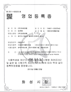 영업등록증 (식품첨가물제조업) 페이지 정보 작성자 최고관리자 댓글 0건 조회 281회 작성일 21-06-30 12:00 본문 영업등록증 (식품첨가물제조업) 목록 이전글영업등록증 (식품소분 판매업) 21.06.30 다음글영업등록증 (식품제조가공품) 21.06.30
