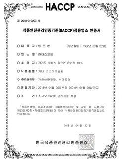 HACCP 인증서 (기타코코아가공품) 페이지 정보 작성자 최고관리자 댓글 0건 조회 310회 작성일 21-06-30 12:03 본문 HACCP 인증서 (기타코코아가공품) 목록 이전글HACCP 인증서 (당류가공품) 21.06.30 다음글우수건강기능식품 제조기준(GMP) 적용업소지정서 21.06.30